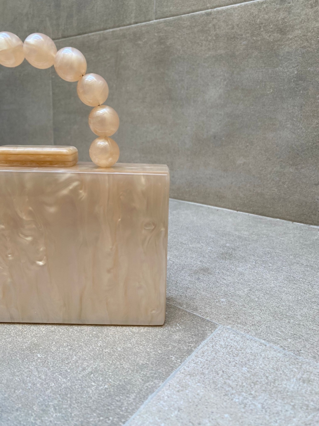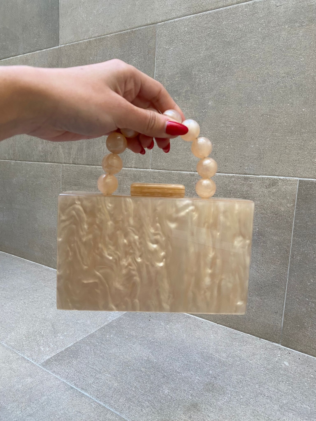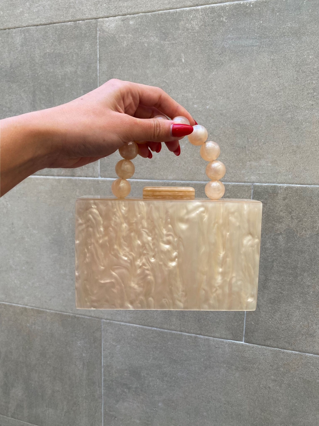 It has a pearly finish and a handle of pearly beads in the same tone of the bag. This clutch is the perfect model for your evening events. You can wear it with the handle or hanging on the shoulder thanks to the golden chain that brings inside.