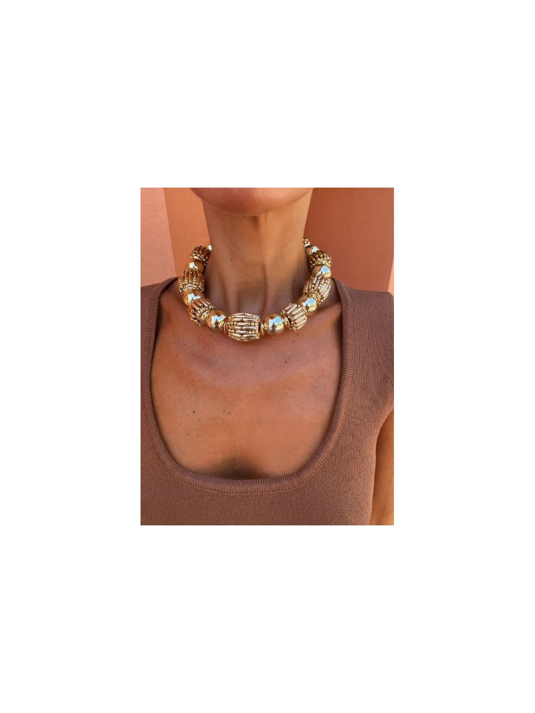 This eye-catching necklace is composed of a mix of large gold-tone beads, combining smooth and rounded shapes with others of more intricate and textured design. It is the ideal accessory to elevate any neckline and add a touch of glamour to your guest looks.