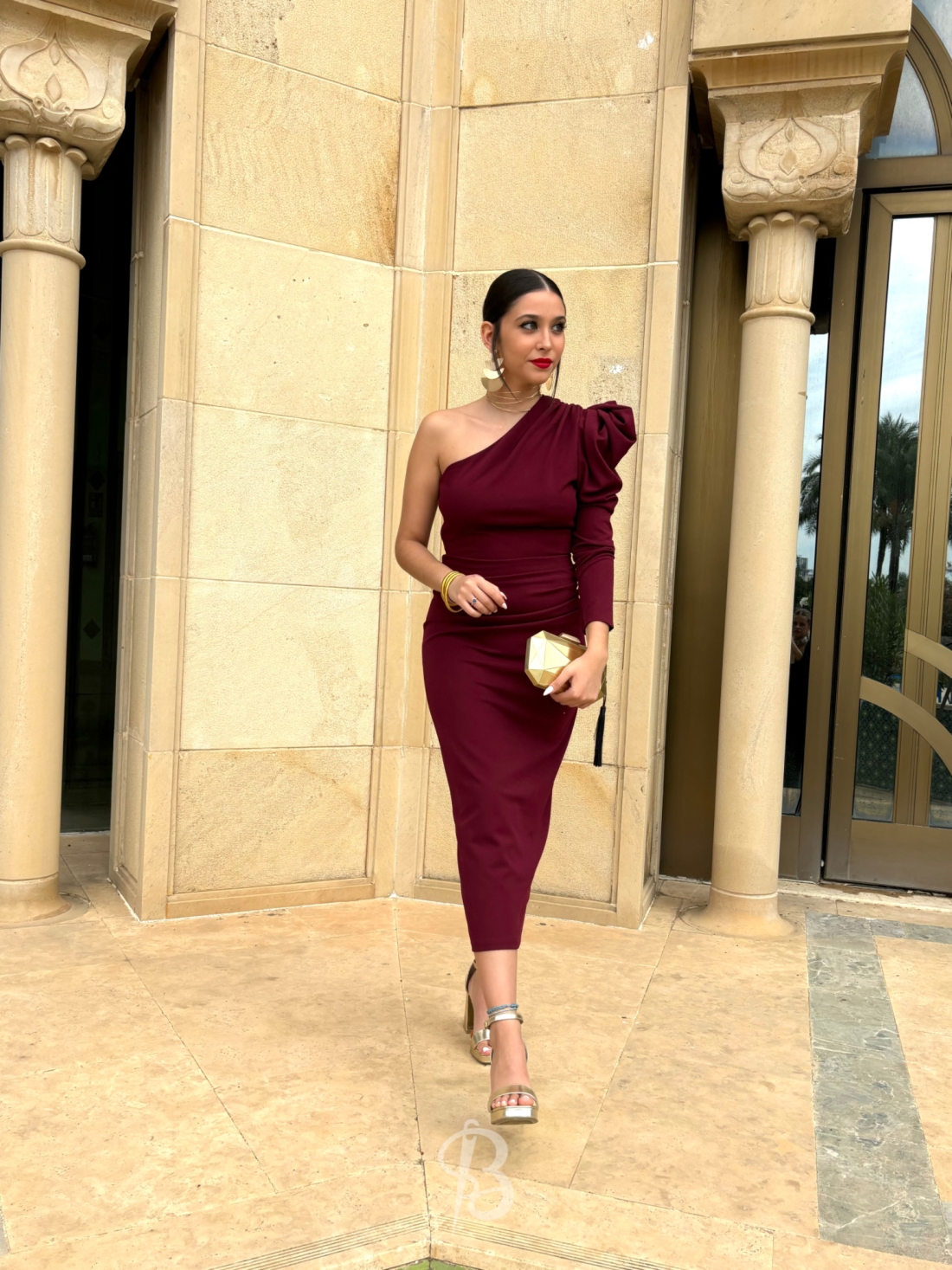 Asymmetrical burgundy party dress with single puffed sleeve, invisible side zipper, side gathering at the waist and back slit. One size fits all