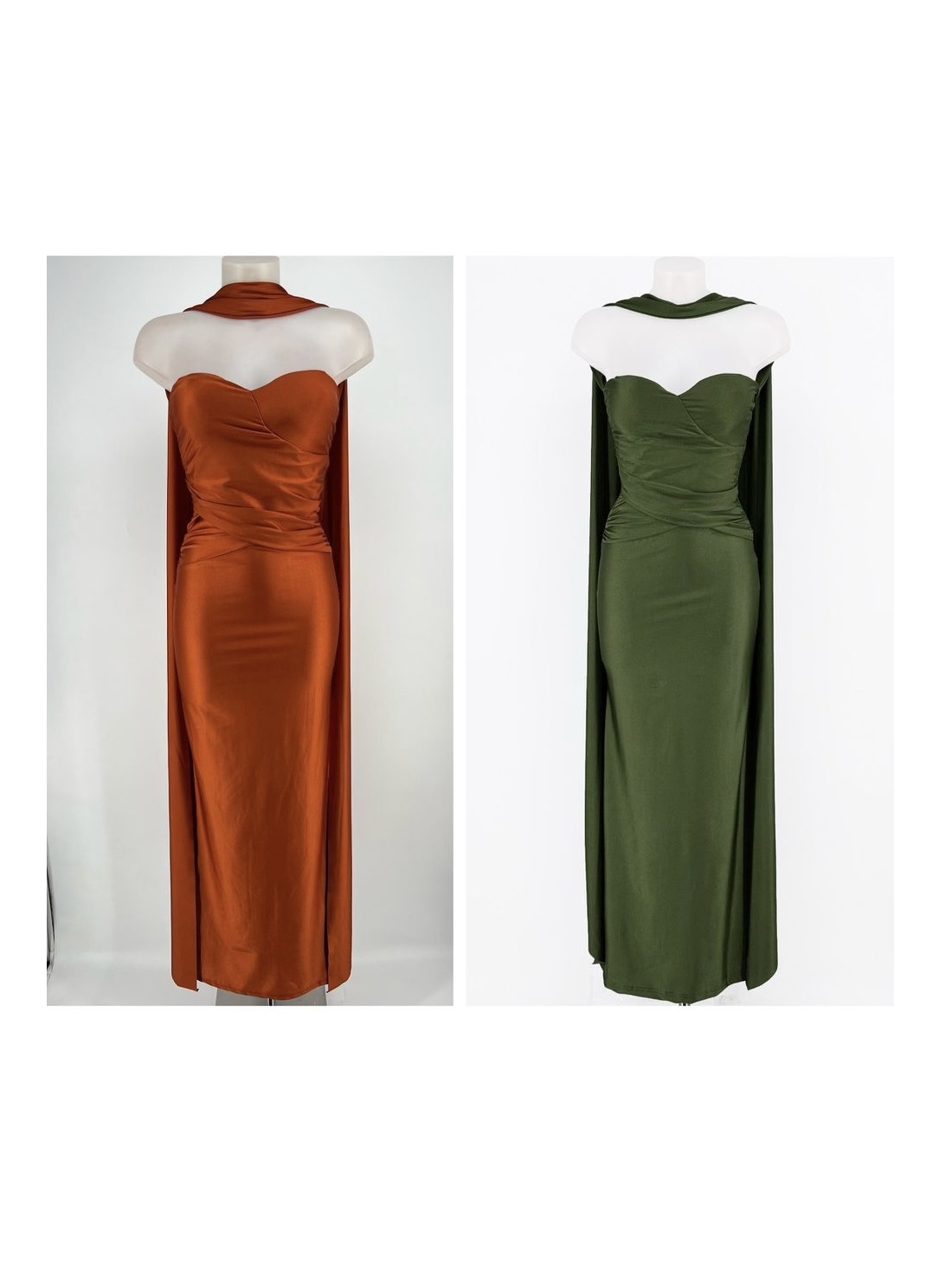 Long caldera dress with strapless neckline, side draping and a long bow sewn from shoulder to shoulder that connects at the neck. One size fits all