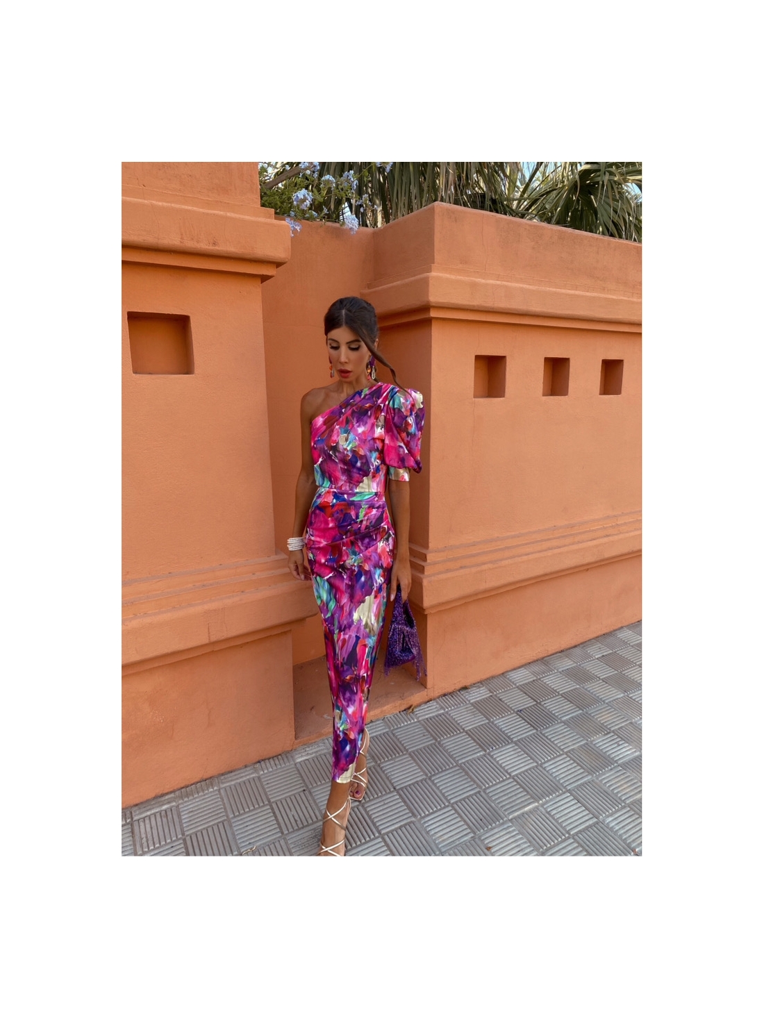 This asymmetrical guest dress features a floral print in pink, purple and light blue tones.
