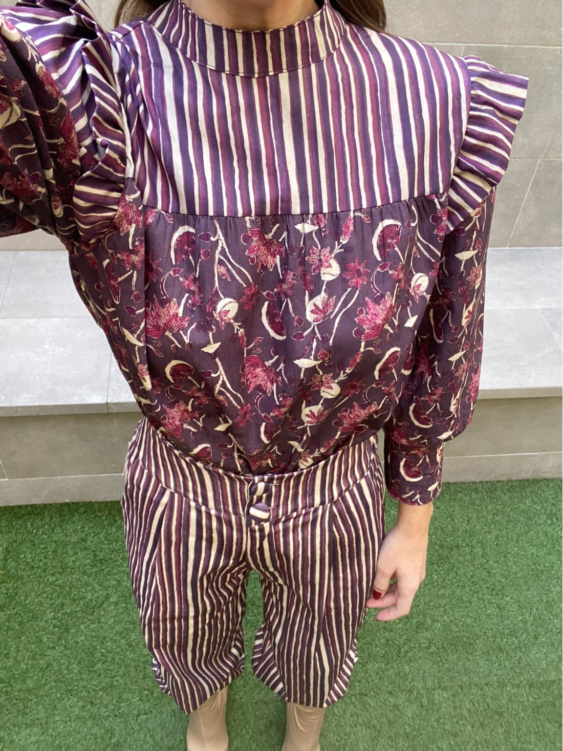 We cannot guarantee the symmetry in the cut of the printed garments so there may be differences with respect to the model in the photograph