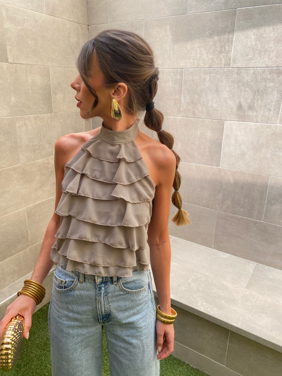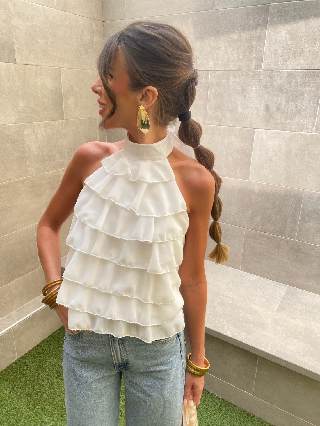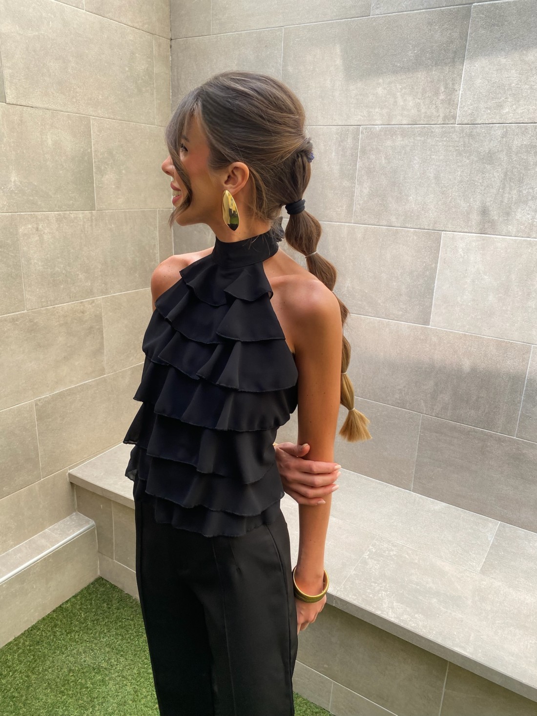Its design centers on an elegant halter neckline that flatters the shoulders, leading to a series of ruffles that add dynamic volume and personality. The magic of this garment lies in its back: a deep V-neck that closes by hand with a bow , allowing for a perfect fit and revealing a suggestive and refined silhouette.