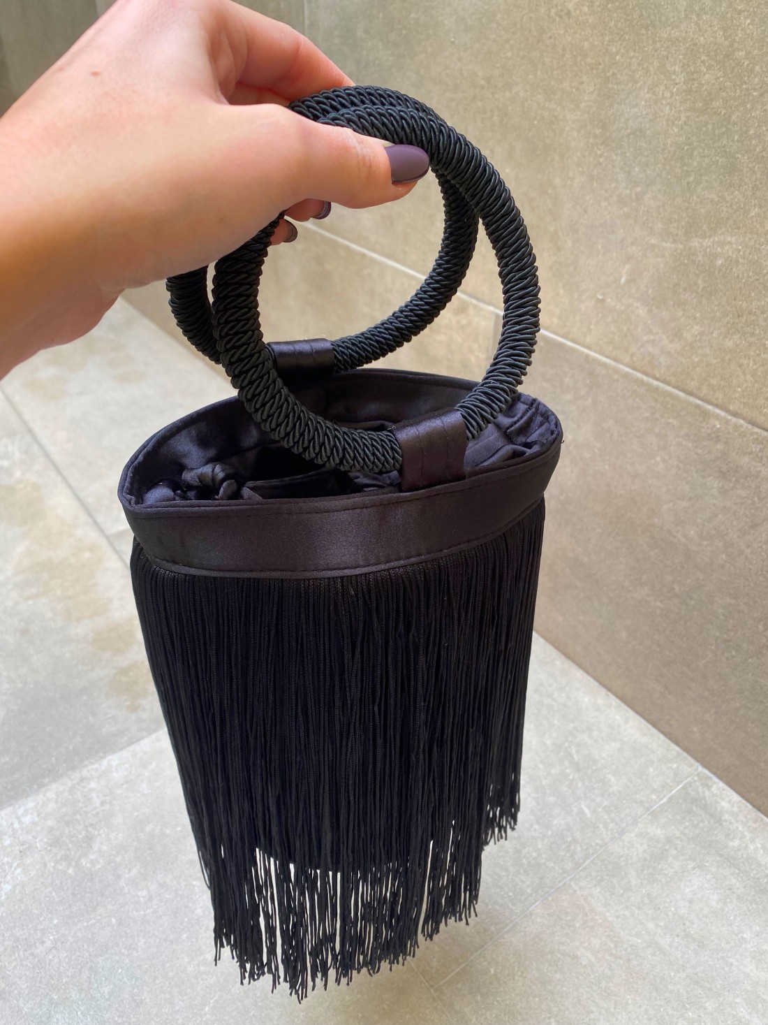 Este modelo destaca por su asa rígida circular con un elegante acabado trenzado, que aporta un contraste moderno y sofisticado a su estructura clásica. Su cuerpo está recubierto por una larga y tupida cascada de flecos de tacto sedoso, diseñados para aportar un flujo hipnótico a cualquier conjunto de fiesta.