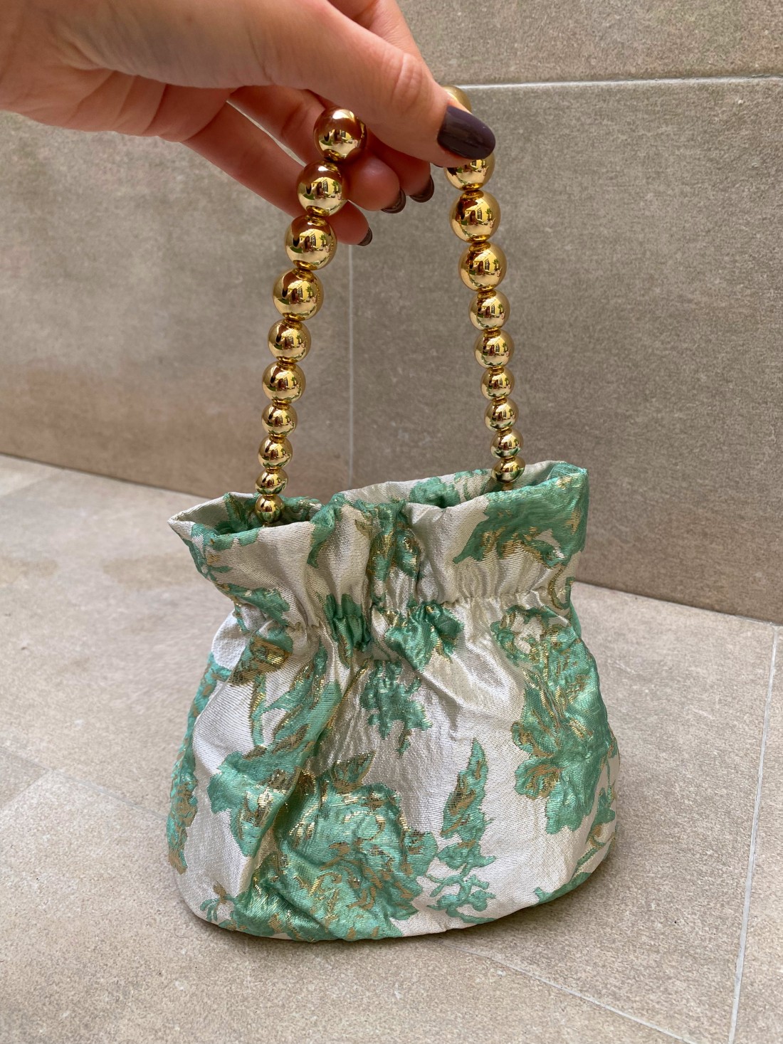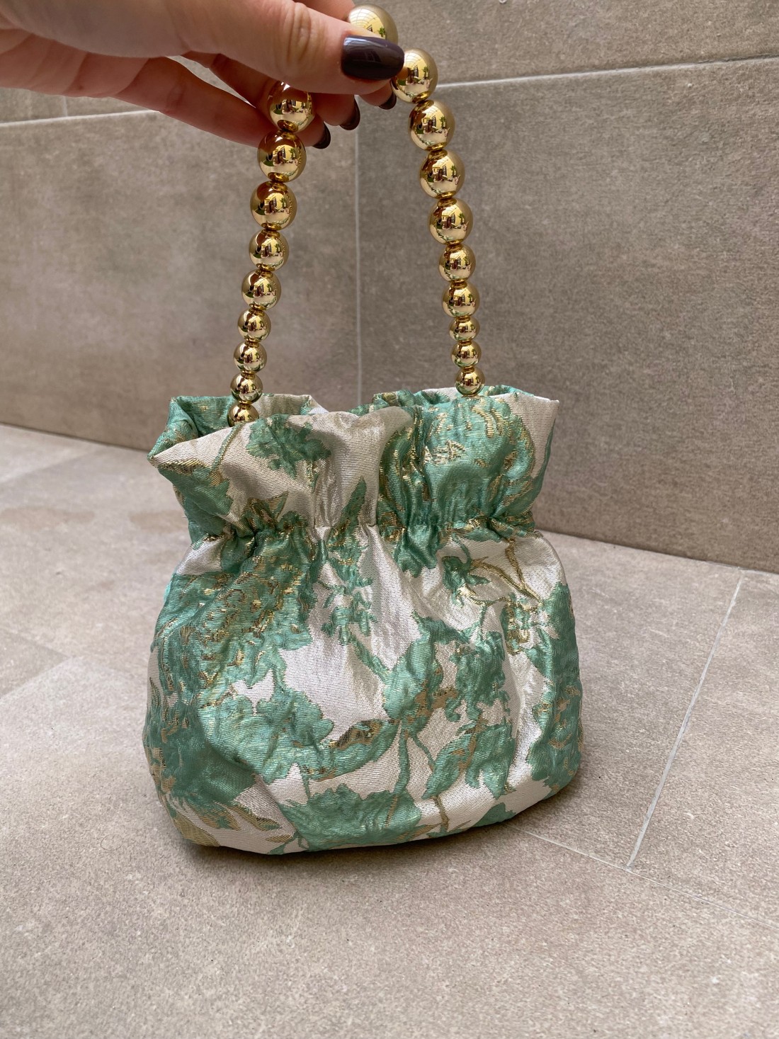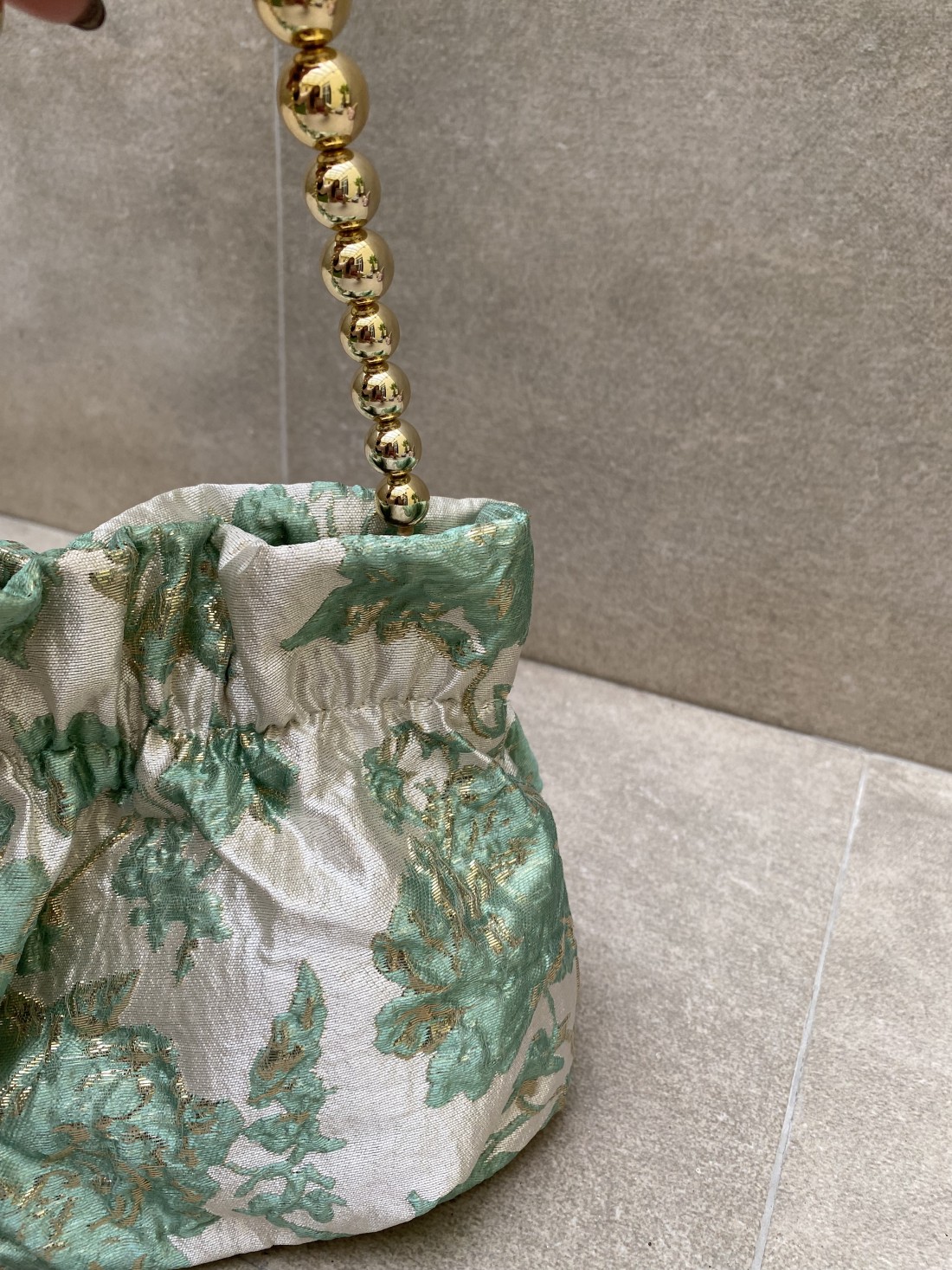La Bombonera Spring Verdeagua es una pieza de diseño exquisito que evoca la frescura y la elegancia de la naturaleza, convirtiéndose en el accesorio ideal para complementar looks de invitada y ocasiones especiales. Este bolso de mano cautiva por su tejido brocado de alta calidad, que presenta un delicado patrón floral en relieve donde el tono verdeagua se entrelaza con hilos dorados, aportando una luminosidad única y un aire de distinción artesanal.