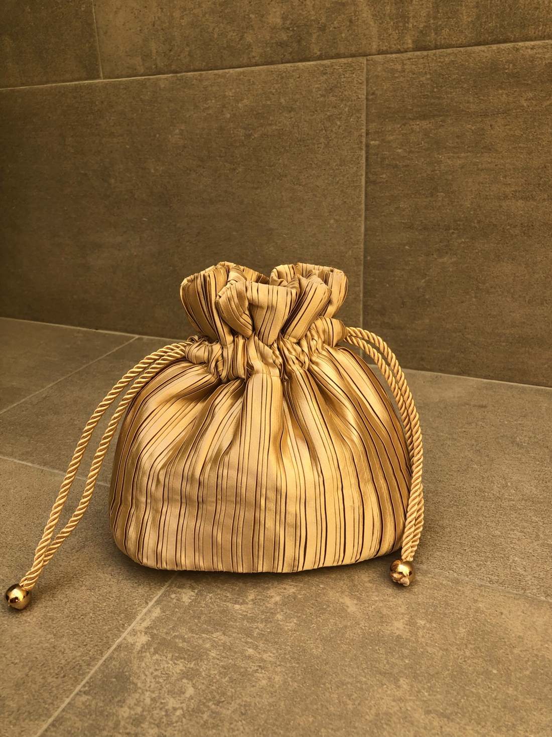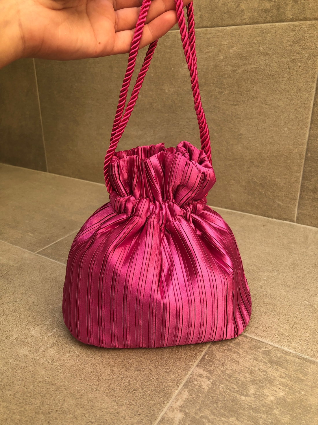 Este bolso tipo bombonera cuenta con un cierre de cordón fruncido que crea una silueta redondeada y elegante, manteniendo tus esenciales seguros con estilo. Sus asas de cordón trenzado permiten llevarla con comodidad y gracia, ya sea colgada de la muñeca o de la mano. Es un accesorio ligero, versátil y con la capacidad perfecta para llevar lo necesario sin renunciar a una estética depurada y femenina.