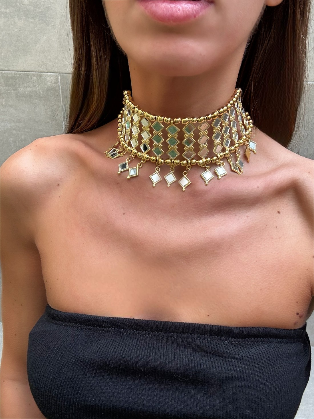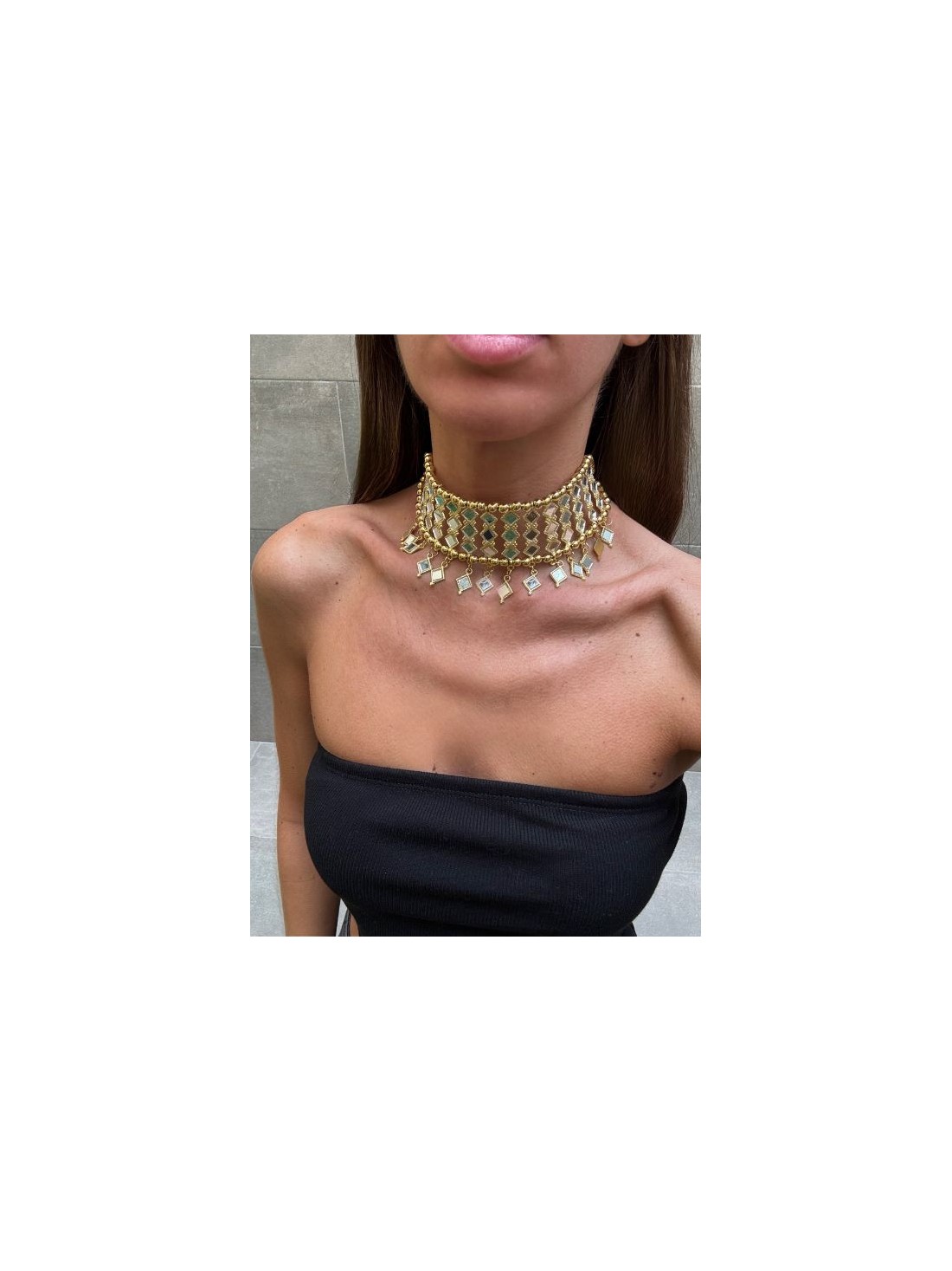 Eleva tu estilo a una nueva dimensión con la Gargantilla Dubai, una pieza de diseño arquitectónico que redefine el concepto de accesorio de lujo. Esta joya destaca por su imponente estructura de malla geométrica, compuesta por una sucesión de rombos metálicos que albergan espejos tallados a mano. Su diseño se completa con una delicada caída de colgantes en forma de rombo que aportan un movimiento hipnótico y un brillo multidimensional, evocando la opulencia y el glamour de la ciudad que le da nombre.