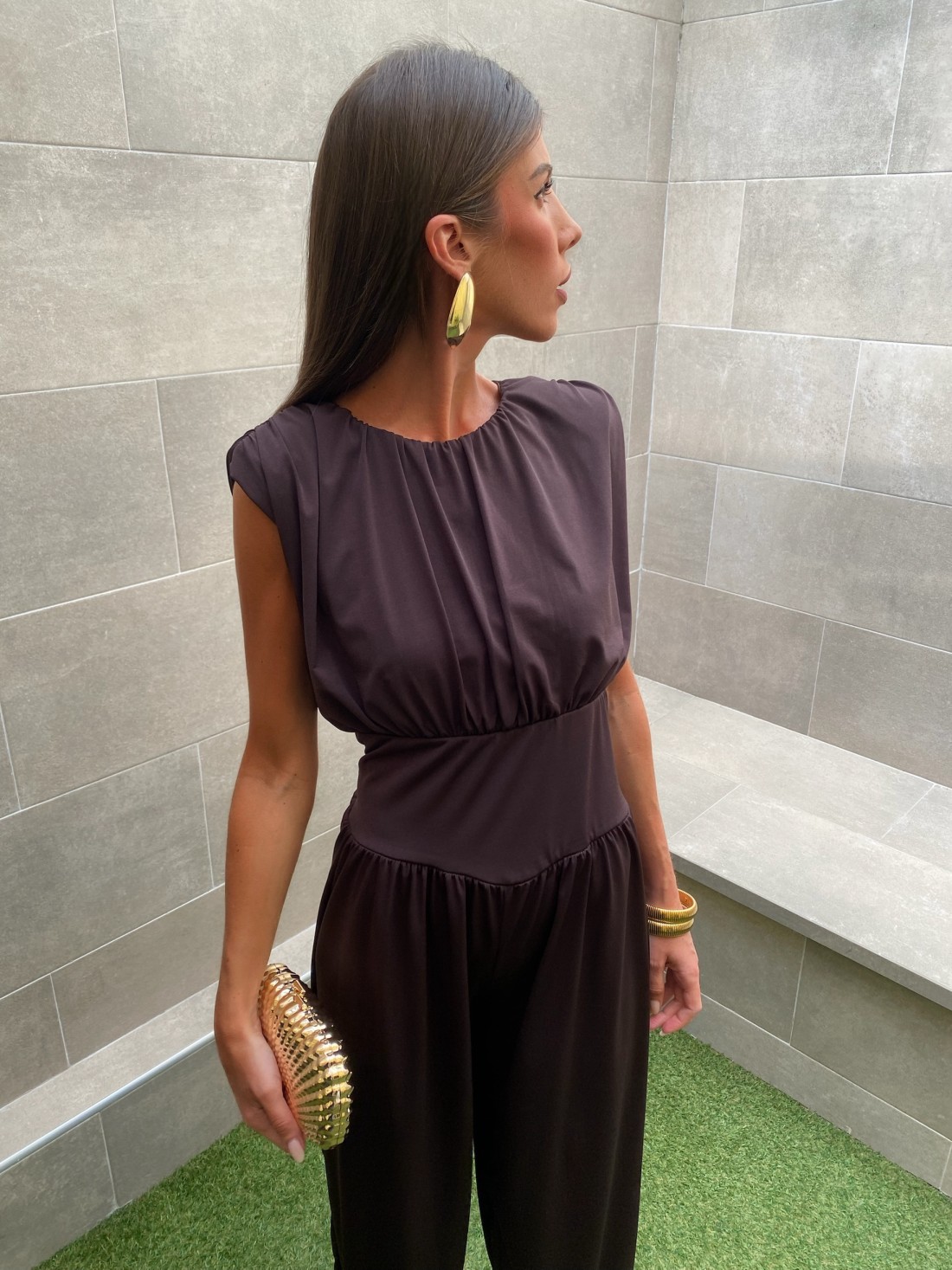 El Mono Walter es la pieza clave para quienes buscan un look de impacto basado en la sobriedad y la arquitectura de la prenda. Este mono largo en color marrón chocolate, confeccionado en un tejido con caída fluida y un brillo satinado muy sutil, redefine la elegancia contemporánea. Es la opción ideal para eventos de tarde, cenas de gala o invitadas de boda que prefieren la fuerza de un diseño liso frente a los estampados.