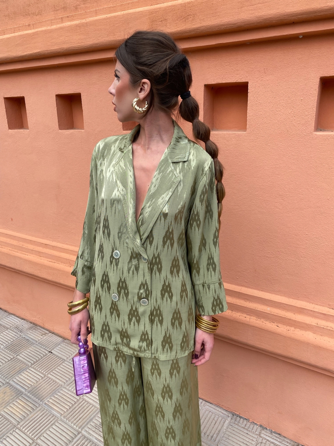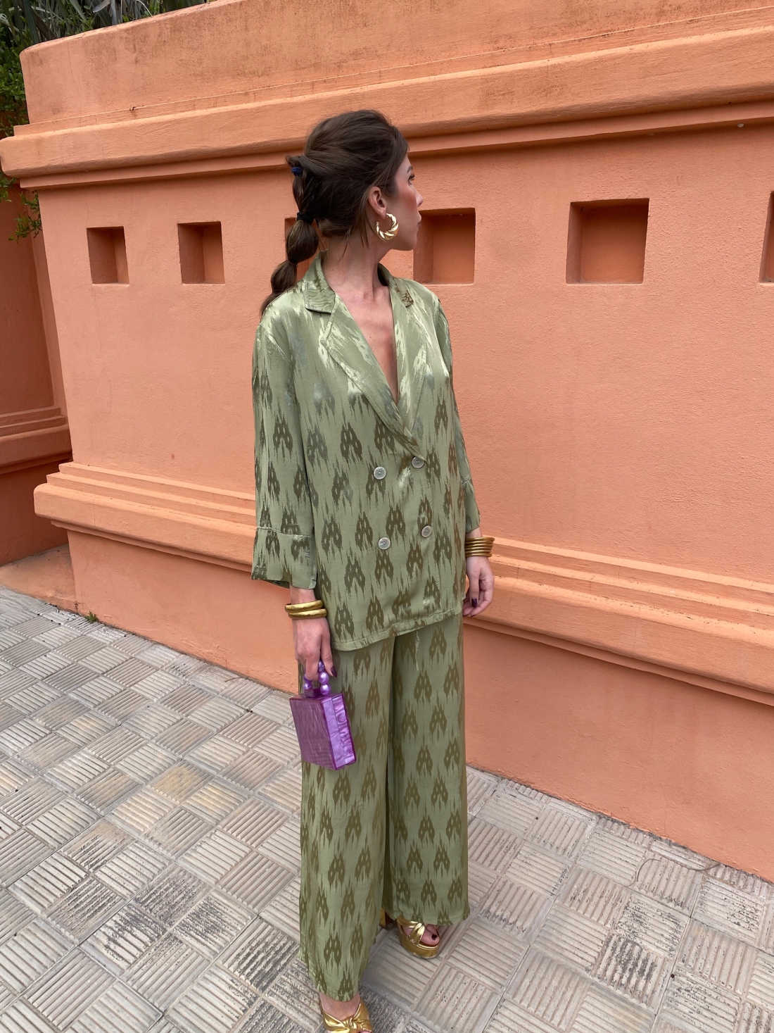 El conjunto está compuesto por una blazer oversize con escote en V y pantalón palazzo, ambos con un estampado en relieve con brillo tipo jacquard.