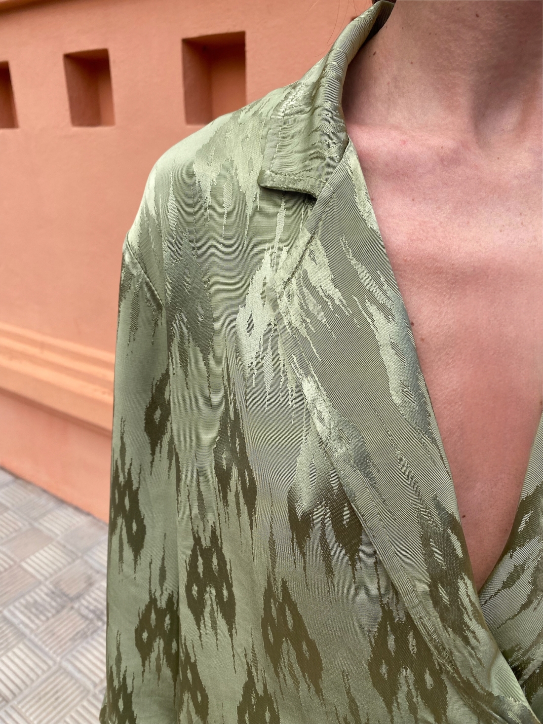 Conjunto de tejido satinado estampado de Blazer cruzada y pantalón en tonos verdes. Blazer con botones nacarados y pantalón palazzo con cintura elástica. El pantalón da mucha talla. Talla única.