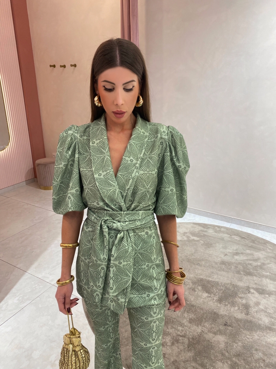 Conjunto de traje de tono verde que incluye un blazer con mangas abullonadas tipo farol, escote en V y cinturón ajustable, junto con un pantalón de tiro alto con cinturilla elástica. Talla única