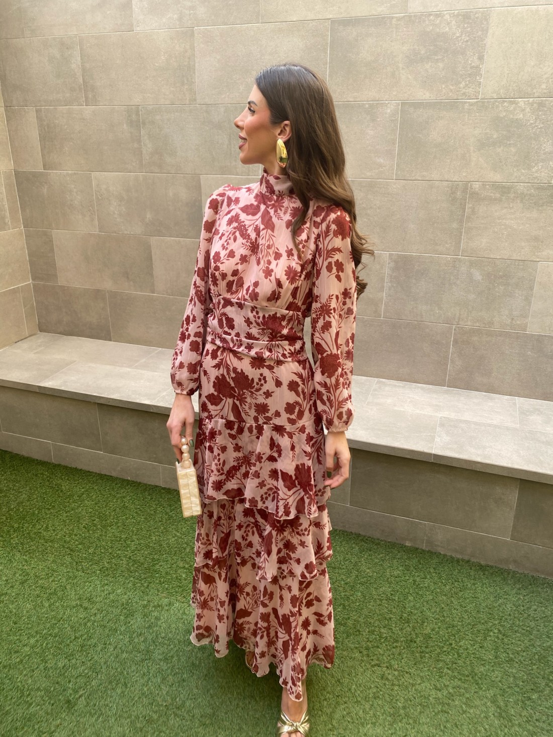 Para un estilismo de diez, combínalo con accesorios en tonos metalizados o nude que cedan todo el protagonismo al estampado. Su estructura de volantes y su acabado refinado garantizan una presencia distinguida y dulce, convirtiéndote en la invitada perfecta.