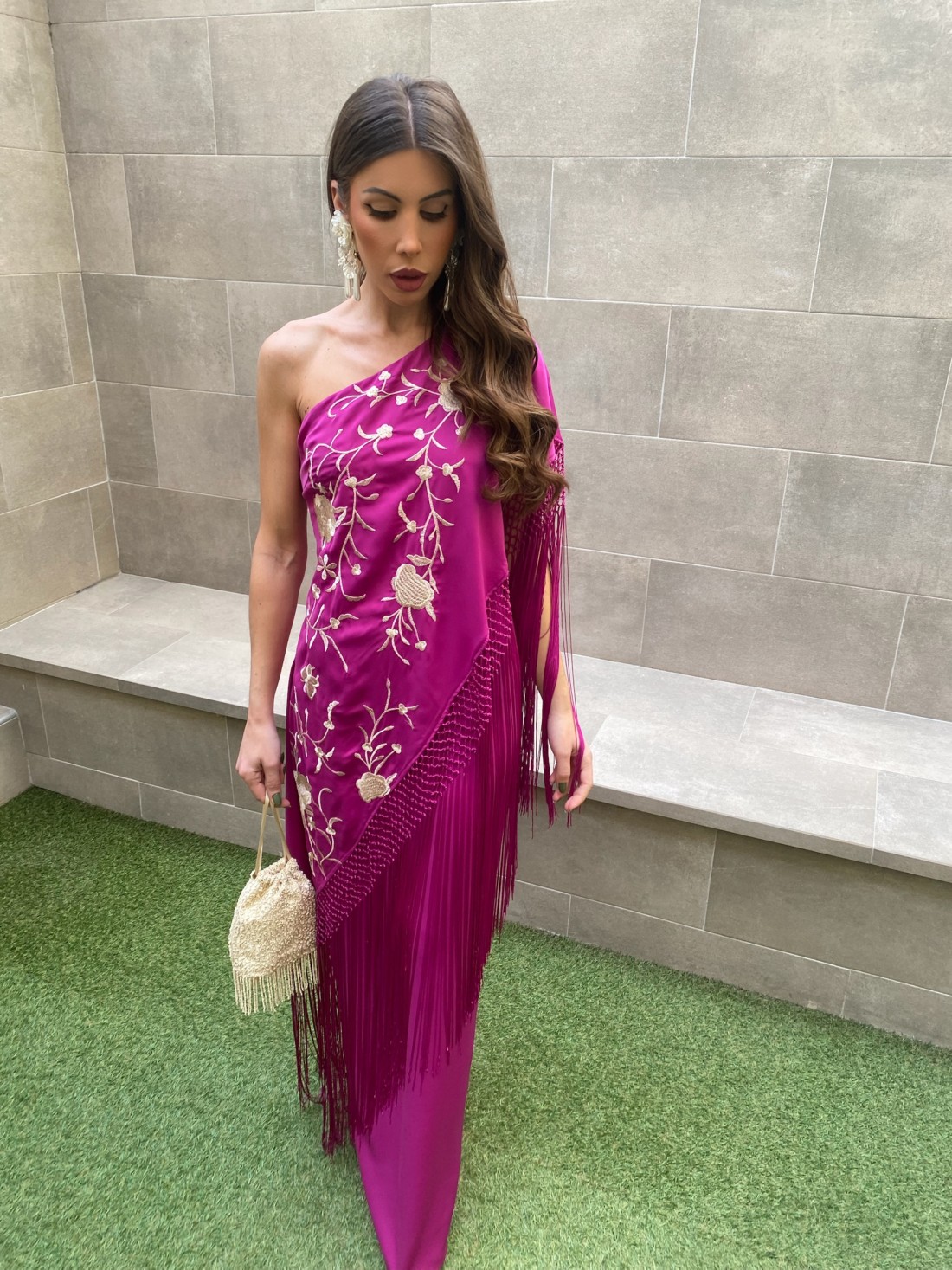 Vestido estilo mantón de color buganvilla, asimétrico bordado con flecos en el lateral. Tres tallas disponibles.