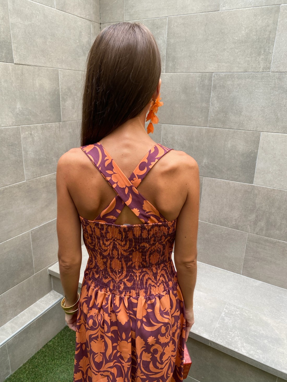 Vestido midi de tirantes cruzados en la parte trasera. Tiene estampado floral de color caldera y burdeos. Tiene nido de abeja trasero. Talla única.