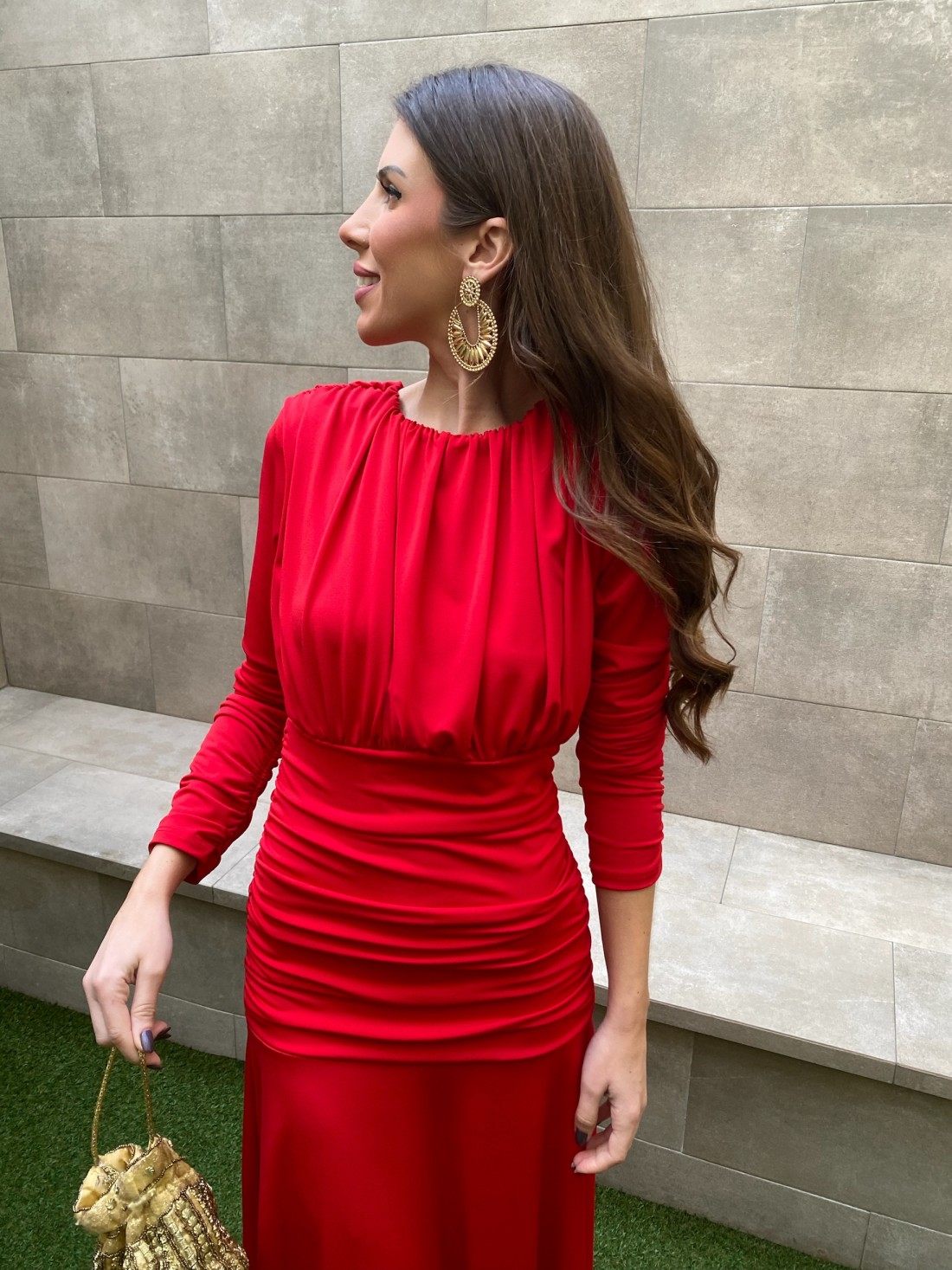La arquitectura de la prenda destaca por su nudo central drapeado, que crea una silueta tipo túnica sumamente favorecedora y original. Sus mangas largas con detalle abullonado aportan un aire de alta costura, equilibrando la intensidad del rojo con una delicadeza romántica. El diseño de este vestido permite una fluidez excepcional, fusionando la comodidad de una prenda ligera con la distinción de un corte de autor. Es una pieza que no solo viste, sino que empodera, asegurando que cada paso sea una declaración de intenciones y buen gusto.