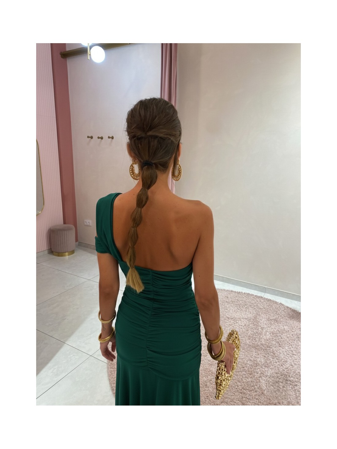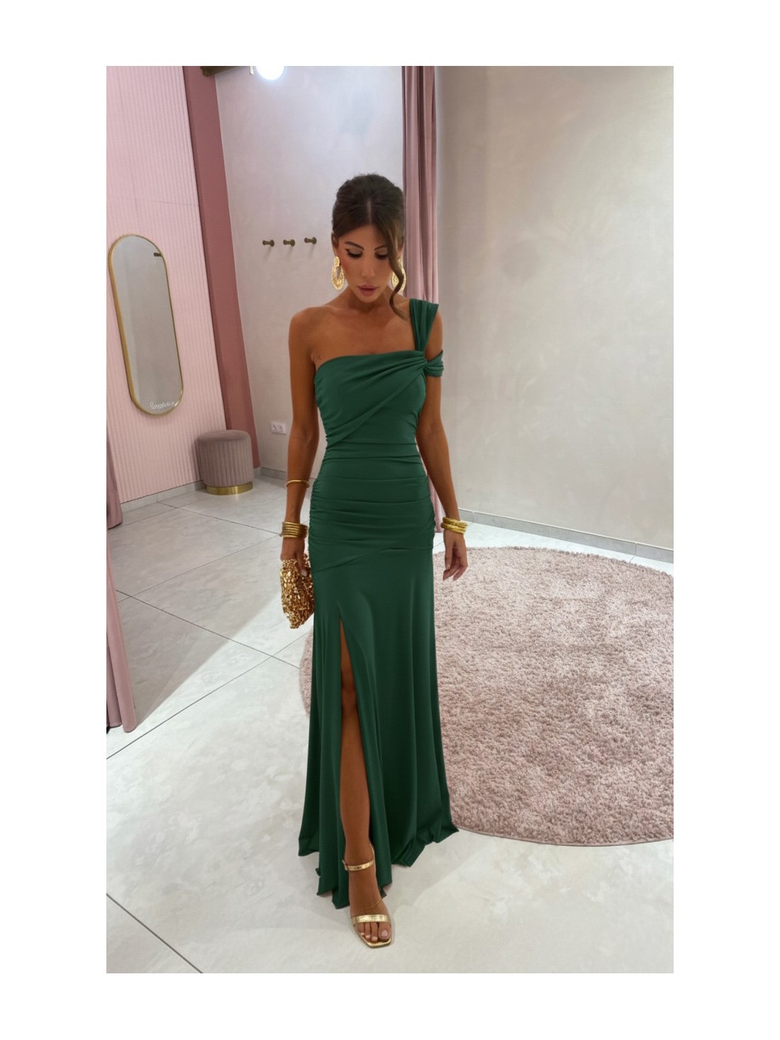Vestido largo liso en color verdebotella elástico, escote asimétrico de doble tirante, cuerpo entallado y falda fluida con abertura. Talla única