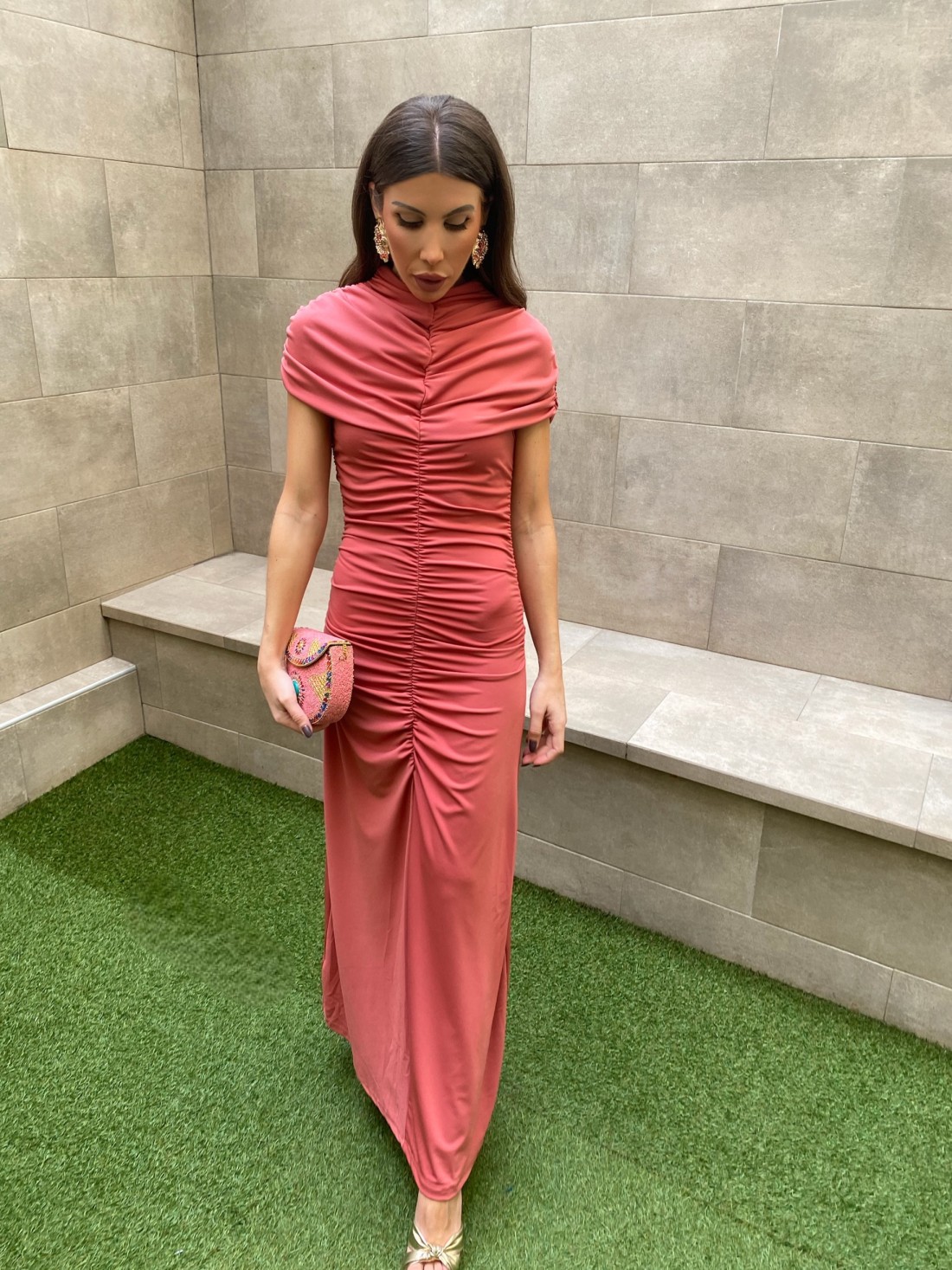 Vestido midi de fiesta salmón con cuello alto tipo perkins y espectacular drapeado a lo largo del cuerpo. Talla única