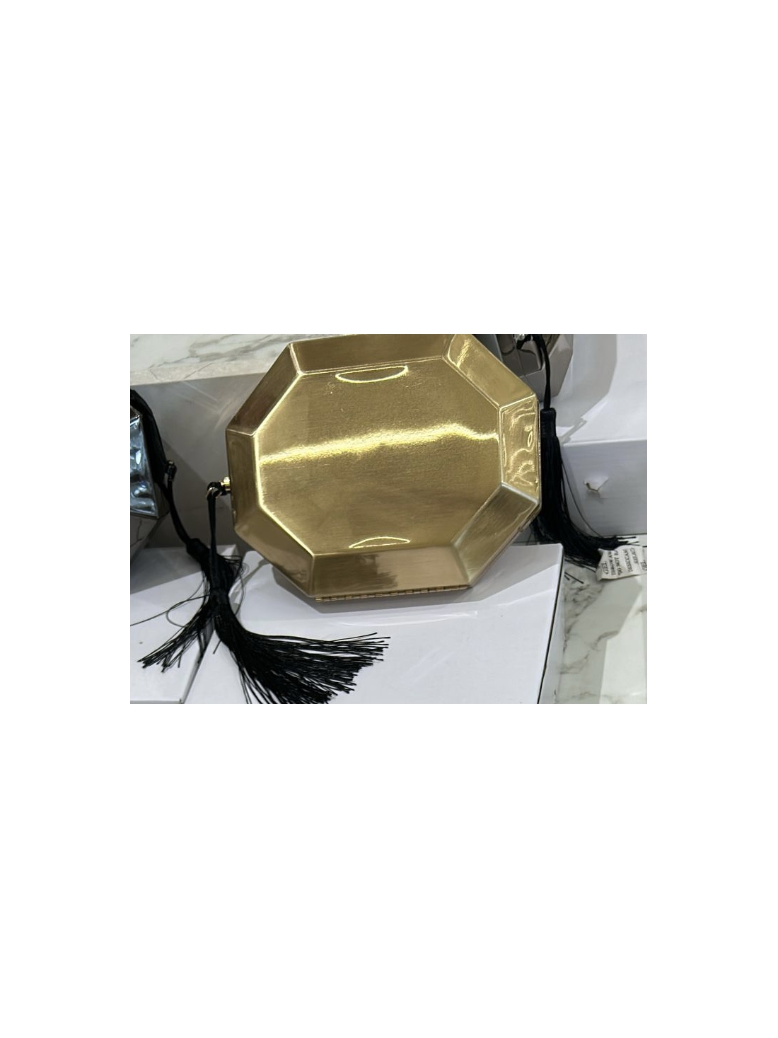 Pochette de fête de forme octogonale en métal doré brillant avec détail de gland noir