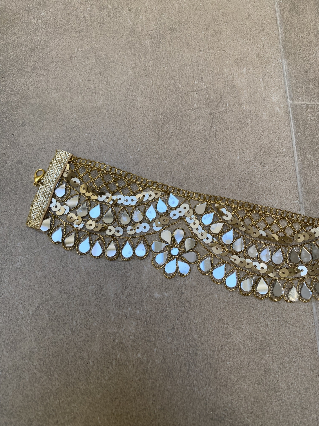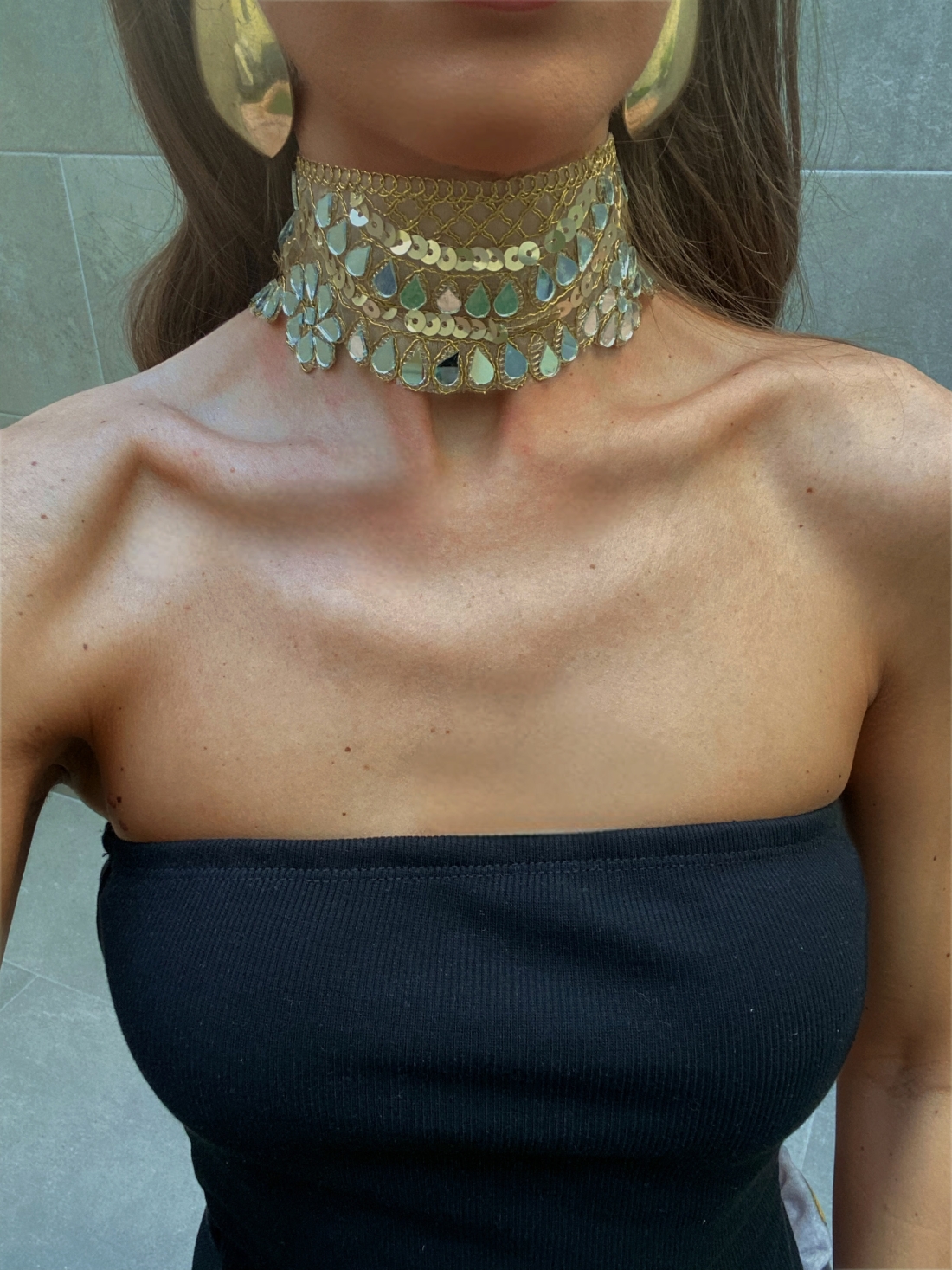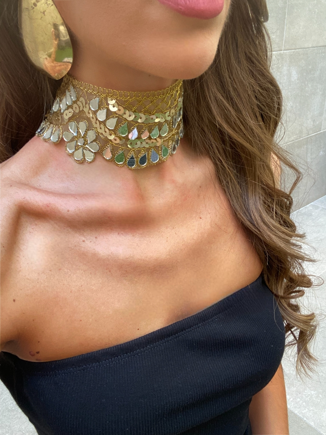 Fini en or scintillant, le tour de cou est composé de plusieurs couches, avec une bande principale qui incorpore des paillettes étincelantes et des détails de fleurs ou de gouttelettes pendantes qui évoquent l'artisanat indien. Son design réglable s'adapte parfaitement au cou, mettant en valeur les décolletés sans bretelles ou plongeants. C'est le bijou d'invité idéal pour un luxe accessible et un style qui rayonne de personnalité et de distinction
