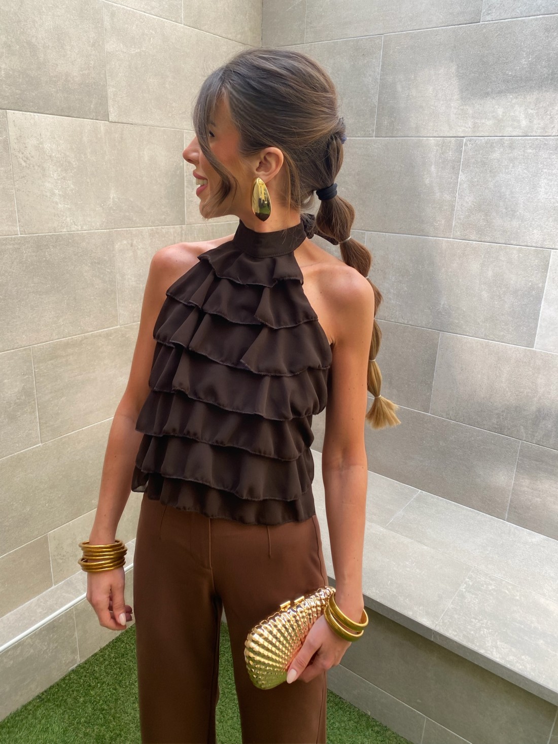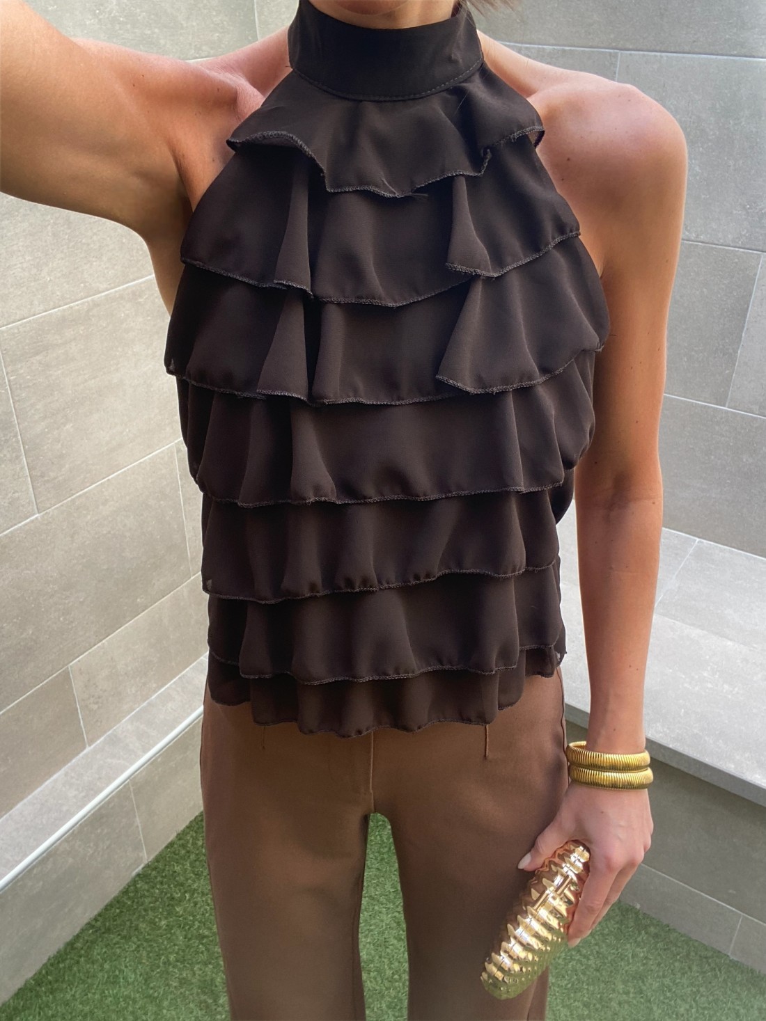 Haut de soirée à col halter, orné de volants cascade et d'un dos nu spectaculaire se fermant par un nœud ajustable. Disponible en plusieurs couleurs. Taille unique.