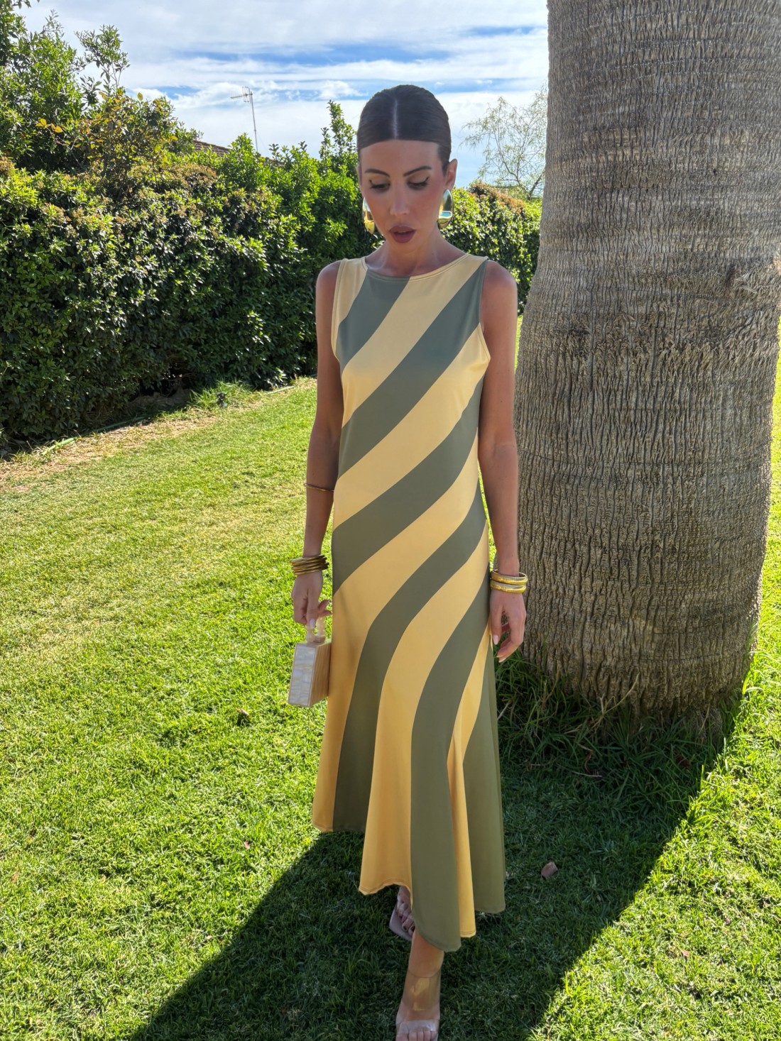 La robe Oporto Olive/Moutarde est idéale pour celles qui recherchent une allure saisissante sans sacrifier le confort. Cette robe mi-longue se distingue par son imprimé audacieux de larges rayures diagonales , qui jouent avec une palette sophistiquée de tons naturels : vert olive et jaune moutarde. C'est le modèle parfait pour les événements de jour, les baptêmes ou les célébrations printanières et estivales qui appellent une touche de style moderne et décontracté.