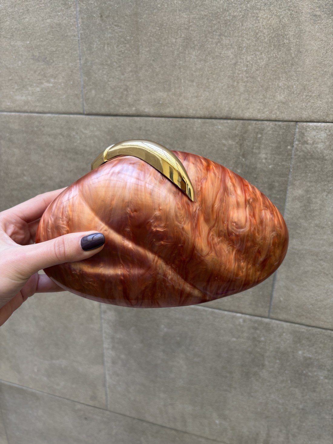 Cette pochette rigide se distingue par sa forme irrégulière , évoquant la douceur d'une pierre polie. Sa surface présente un exquis effet marbré aux veines nacrées , créant un jeu unique de textures et de reflets sous la lumière.