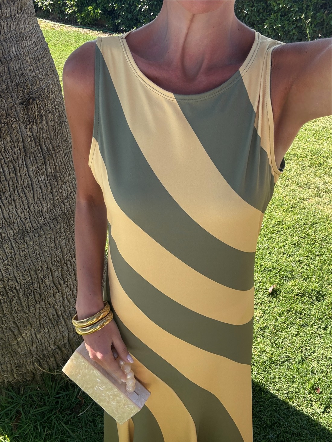 Abito bicolore con spalline larghe, scollo rotondo e stampa a righe diagonali verde oliva e giallo senape. Taglia unica.