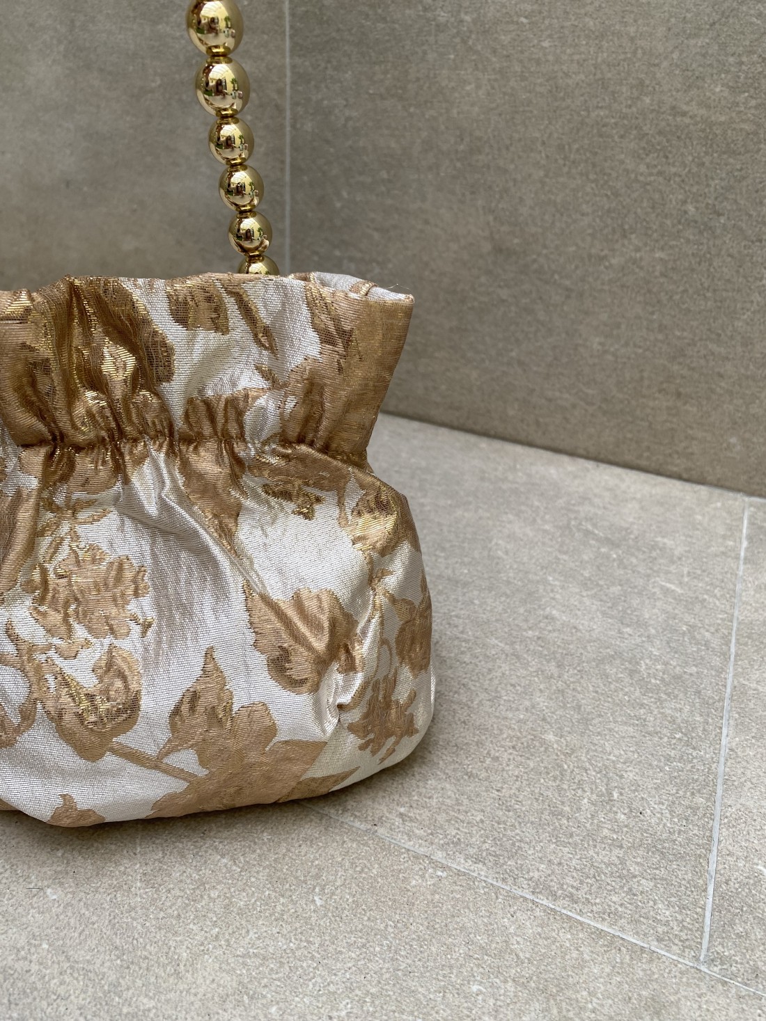 Il suo design strutturale è caratterizzato da una sofisticata chiusura a volant che crea eleganti pieghe nel tessuto, mentre il manico rigido a sfera d'oro agisce come un'estensione dei suoi gioielli. Questo dettaglio da 'borsetta gioiello' eleva istantaneamente qualsiasi abbigliamento, rendendola un accessorio indispensabile per matrimoni serali, serate di gala ed eventi black tie.