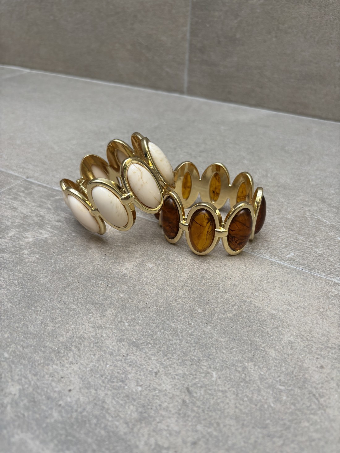 Il bracciale Menorca è il gioiello perfetto per chi cerca un accessorio di carattere e personalità. Questo bracciale rigido si distingue per il design con maglie ovali in rilievo, che uniscono il calore della placcatura in oro a pregiati inserti in resina sfaccettata, creando l'effetto di un lussuoso gioiello artigianale.