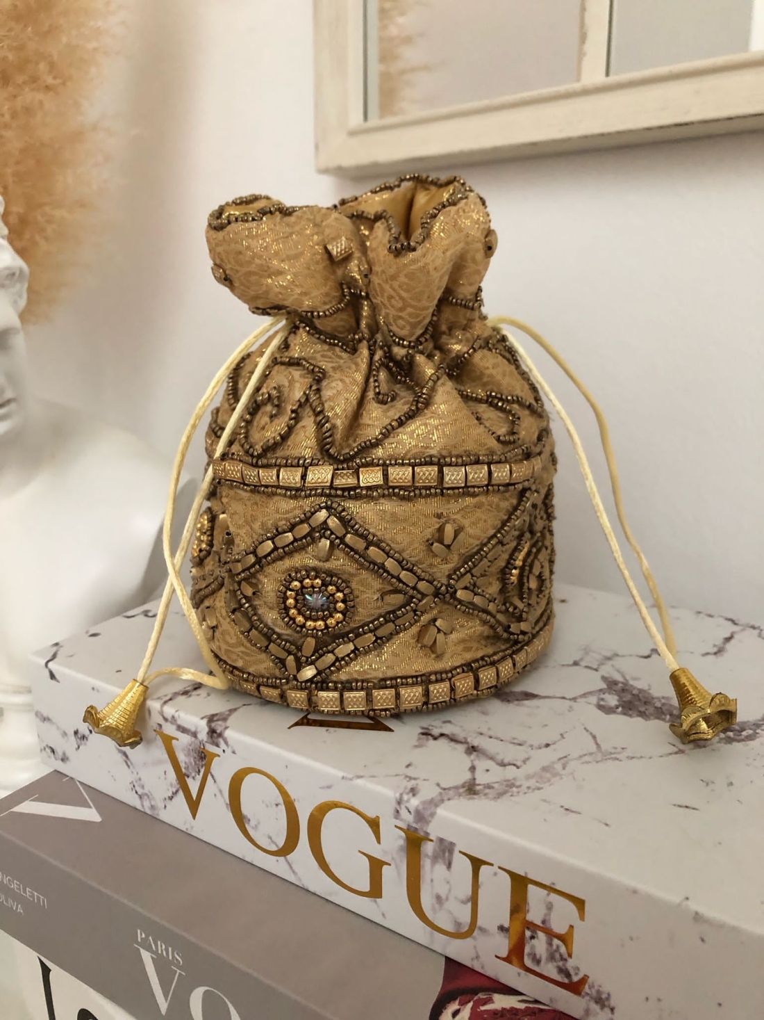 Borsa placcata in oro in stile arabo, decorata con perline e dotata di una lunga corda interna per appenderla