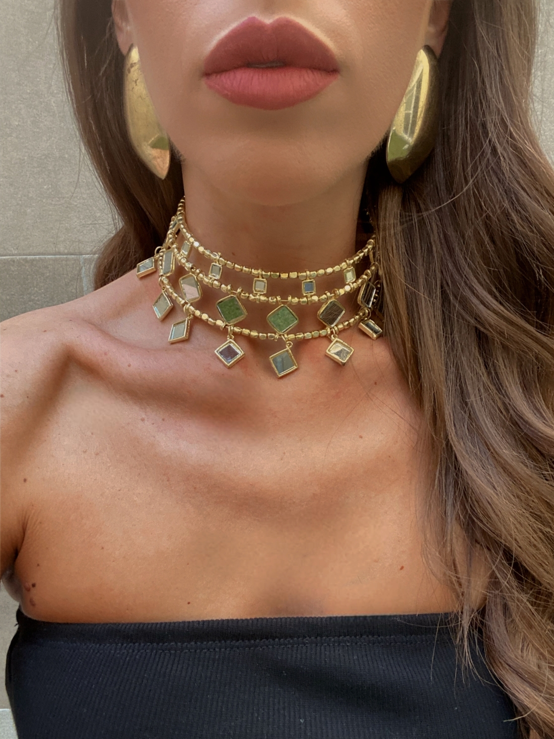 Com acabamento em ouro cintilante, a gargantilha apresenta um design de três (ou mais) camadas com detalhes geométricos e pedras preciosas que captam a luz de forma espetacular. É o acessório perfeito para complementar decotes sem alças, decotes em V ou blusas de gola alta, criando um ponto focal deslumbrante e intemporal. É a joia convidada ideal para um luxo acessível e um estilo que exala confiança e personalidade.