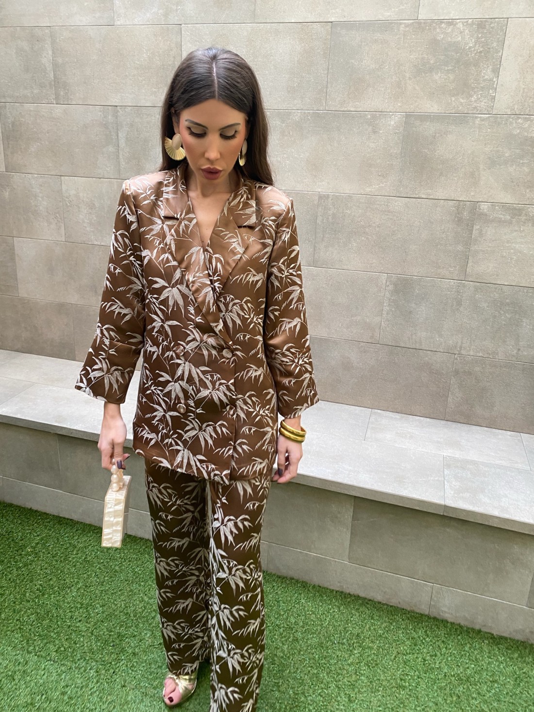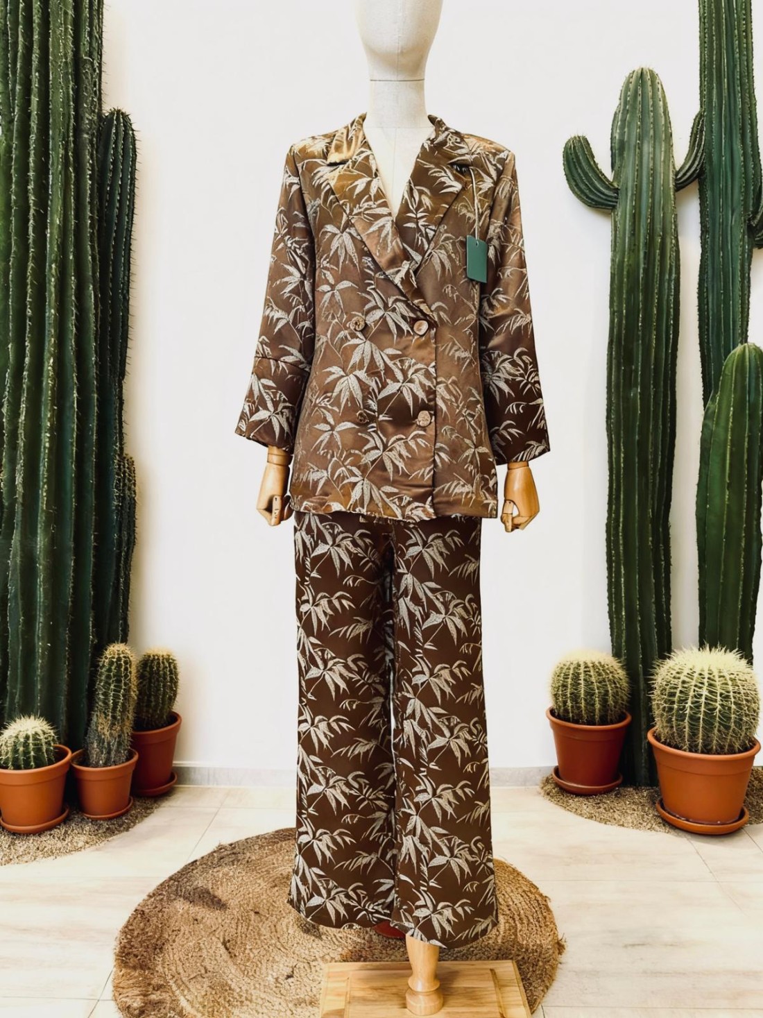 Conjunto marrom com estampa bordada, composto por um blazer oversized com botões forrados e calça reta com bolsos, cintura alta e elástico na parte de trás. Tamanho único (veste a maioria dos tamanhos Plus).
