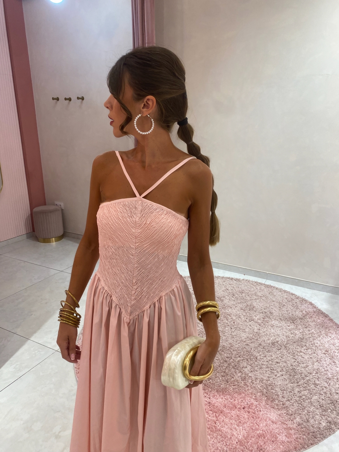 Vestido midi cor-de-rosa com decote em V, alças em V, torso com folhos e saia plissada com pregas, costas em favo de mel. Tamanho único