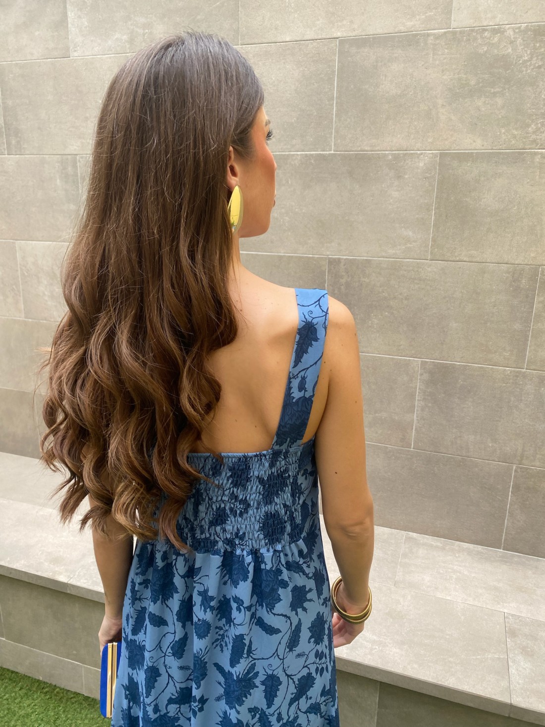 Vestido com estampa floral em tons de azul, com alças e saia evasê. Disponível em dois tamanhos.