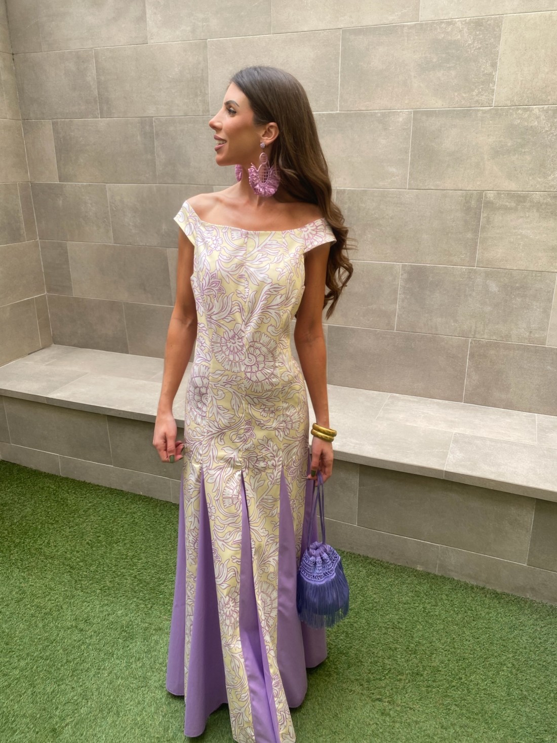 Para um look memorável, combine-o com acessórios lavanda ou sandálias metalizadas que realcem a paleta de cores do vestido. É uma peça versátil e luminosa que garante que você brilhará em qualquer casamento ou evento especial nesta temporada.