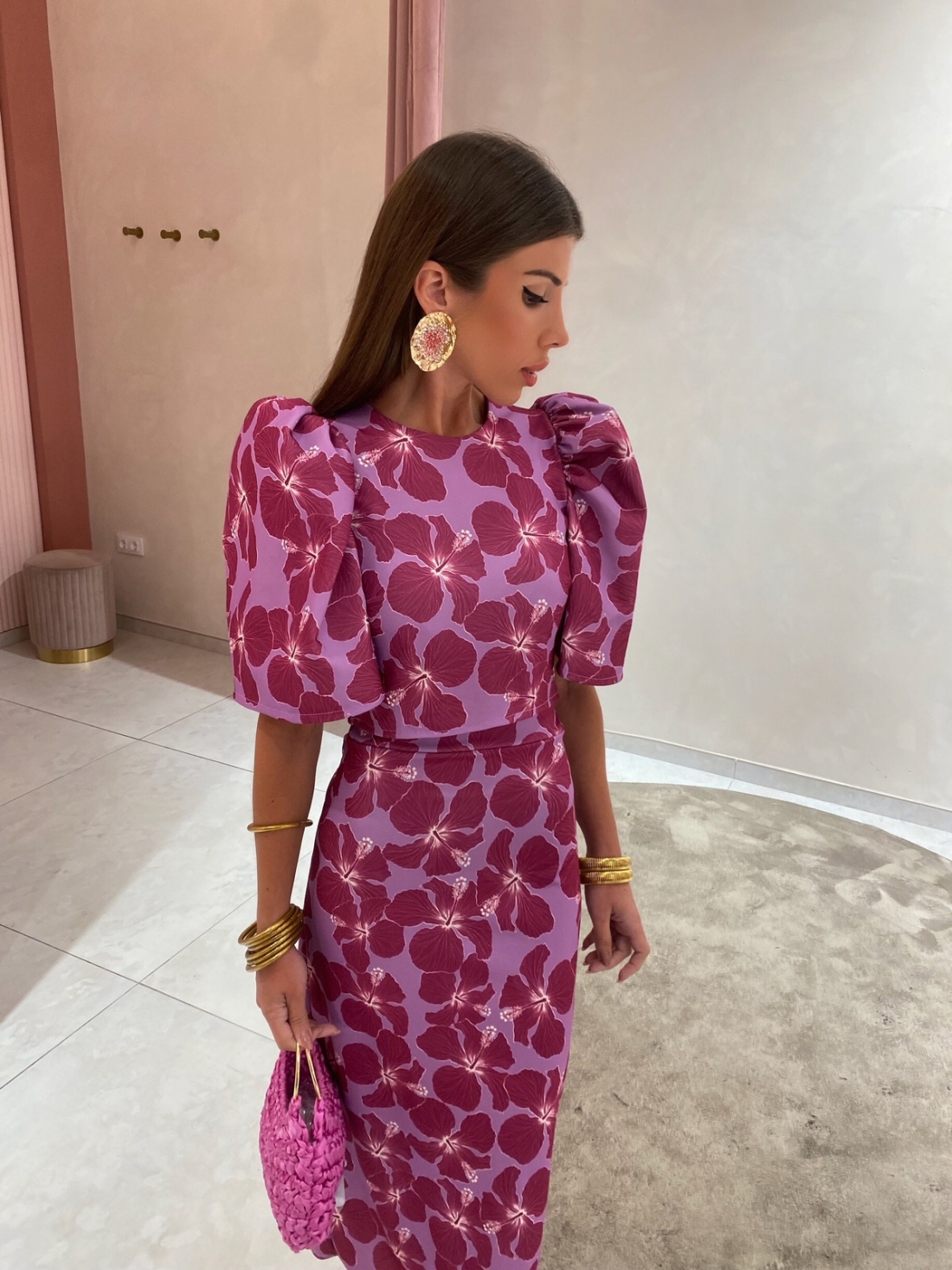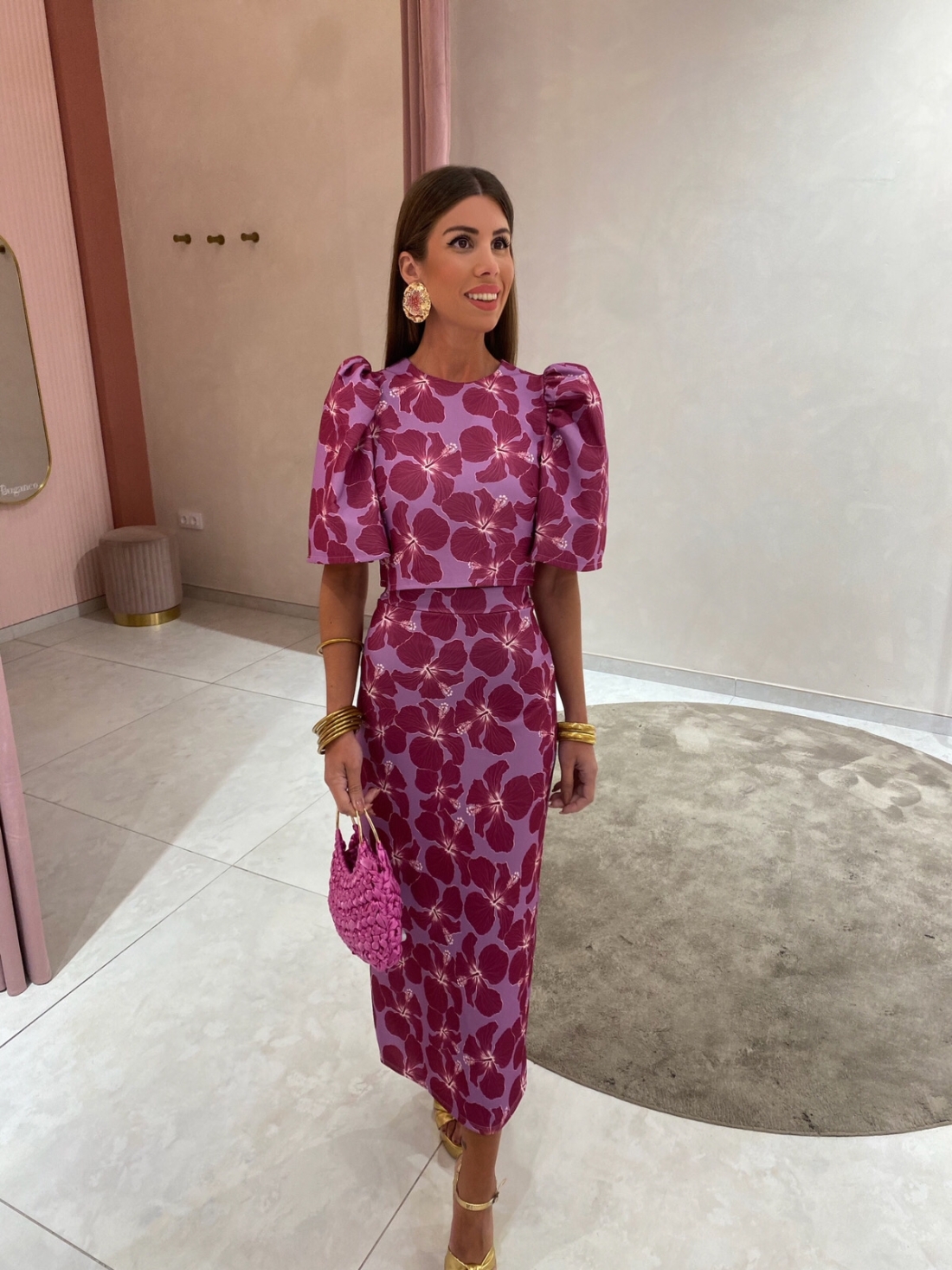 A saia reta e justa acentua elegantemente a silhueta, enquanto o top com mangas bufantes acrescenta um toque de distinção e modernidade. Perfeito para um casamento de dia ou uma celebração especial, este conjunto estampado fá-la-á sentir-se única. Combine-o com os seus acessórios preferidos e prepare-se para brilhar.