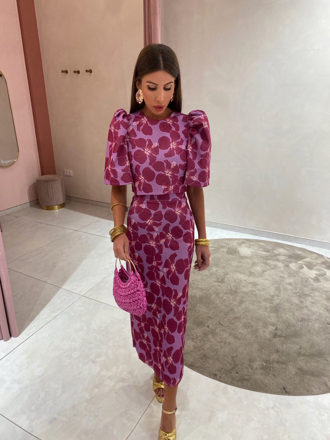 Deslumbre com o conjunto Paprika, um sofisticado conjunto de top e saia com um delicado estampado floral em tons de malva.