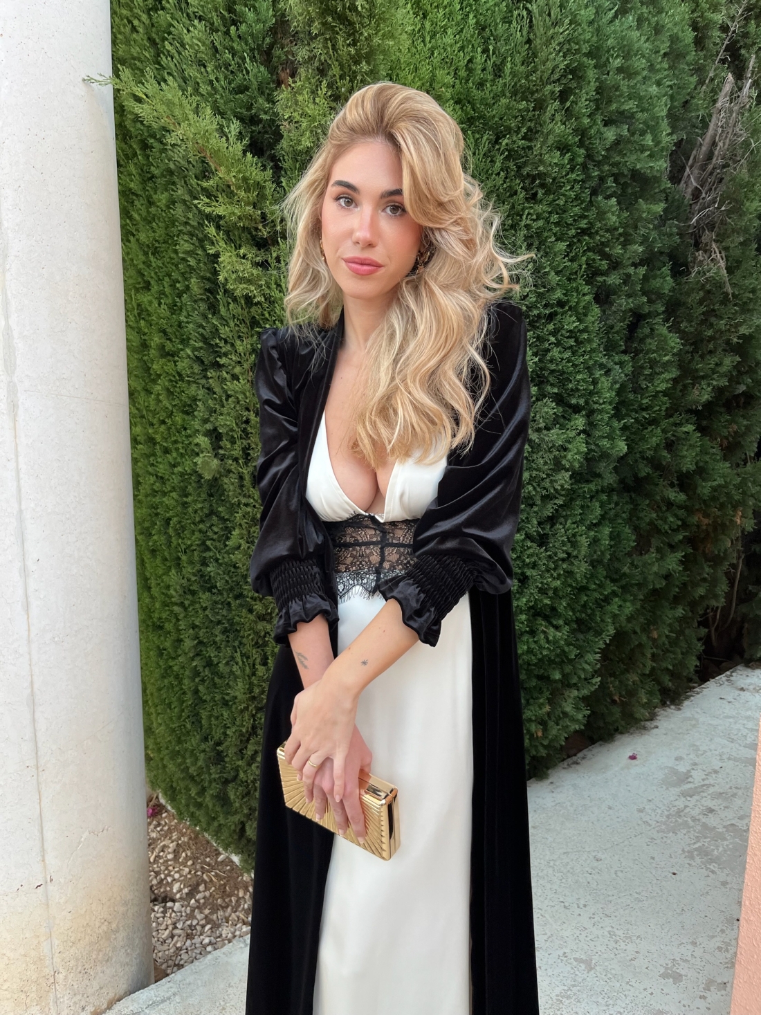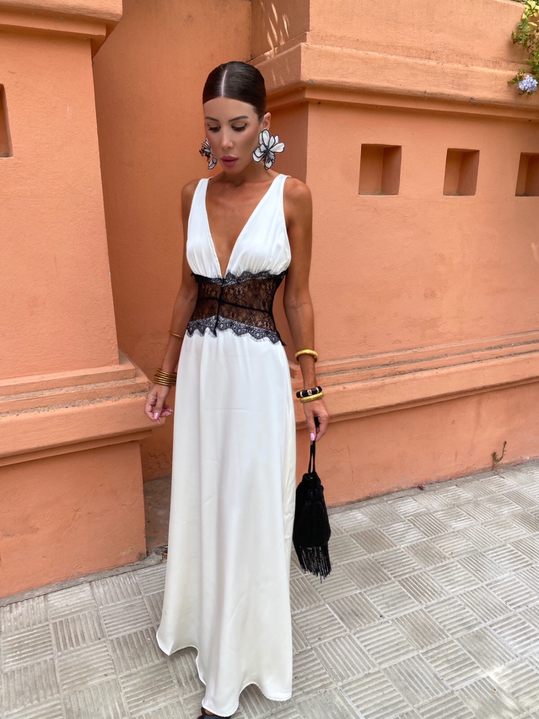Vestido de lingerie comprido em creme e preto com pormenor de renda no abdómen e fecho invisível nas costas. Disponível em tamanhos