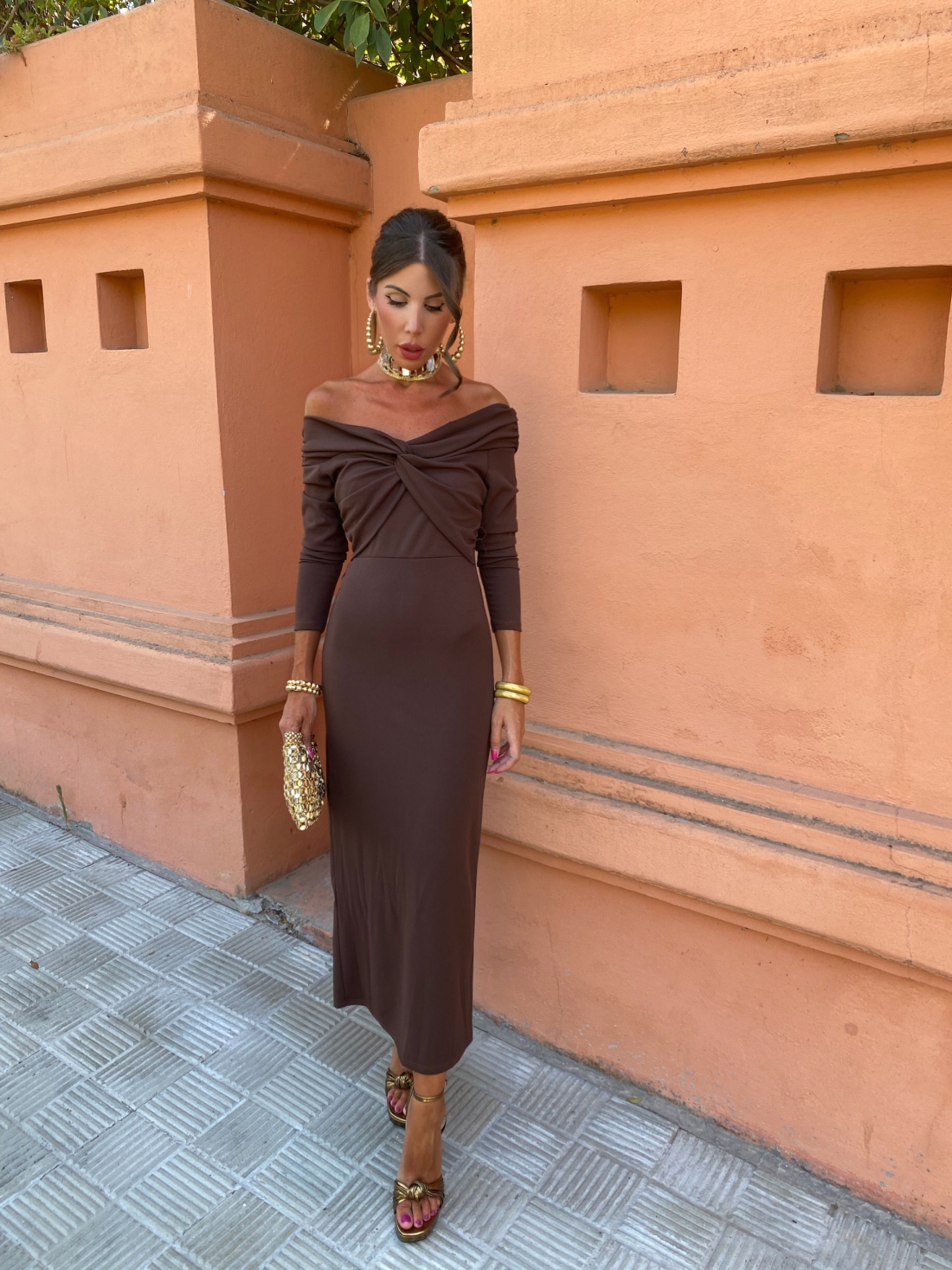 Vestido largo marrón con escote de barco y detalle cruzado en el pecho. Tiene raja trasera. Talla única